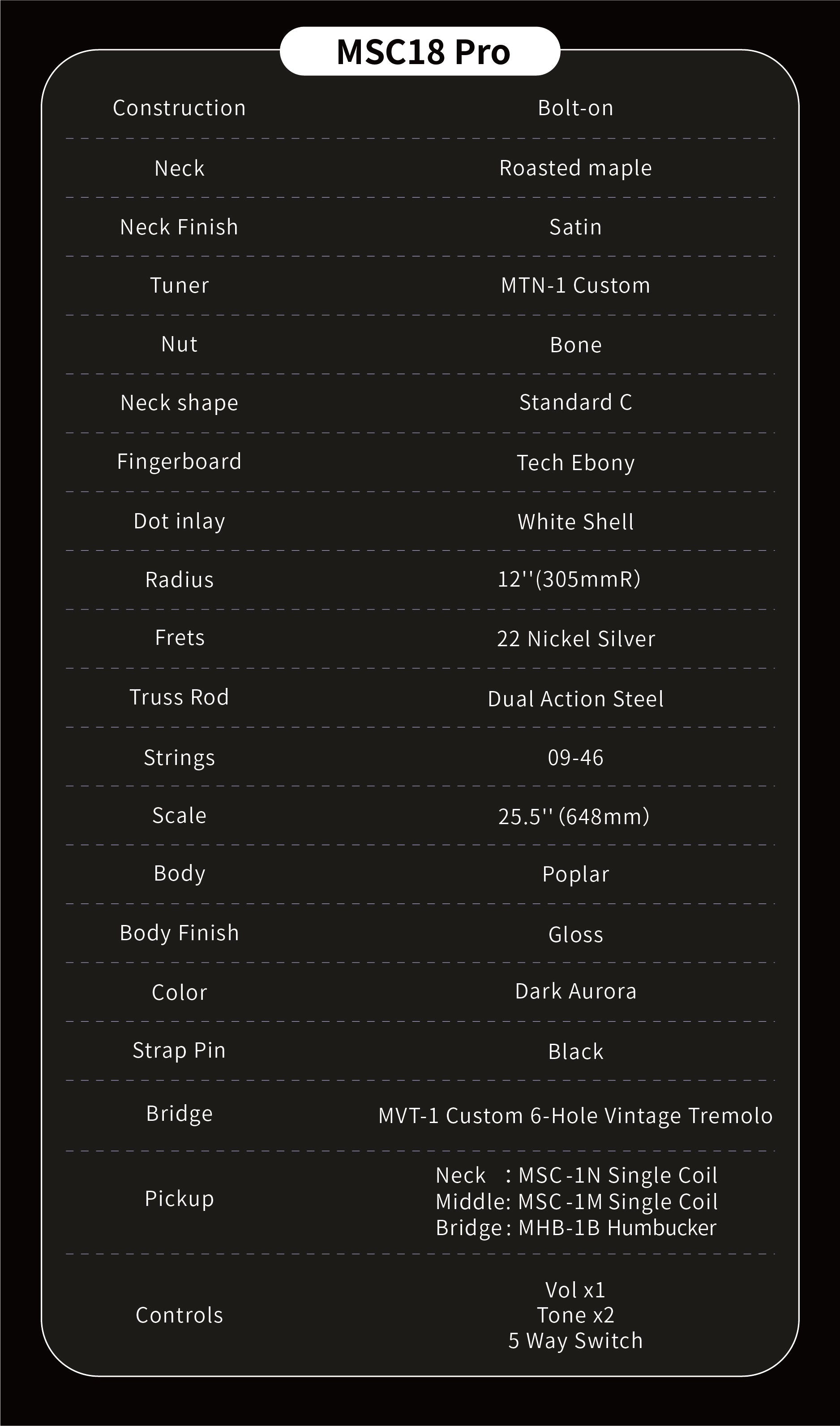 The MOOER MSC18 Electric Guitar is the flagship model of the MSC Pro series, offering a sleek Dark Aurora finish with black hardware for a bold, modern aesthetic. Designed for versatility and high-performance playability, this guitar is ideal for musicians seeking premium craftsmanship with dynamic tonal options.